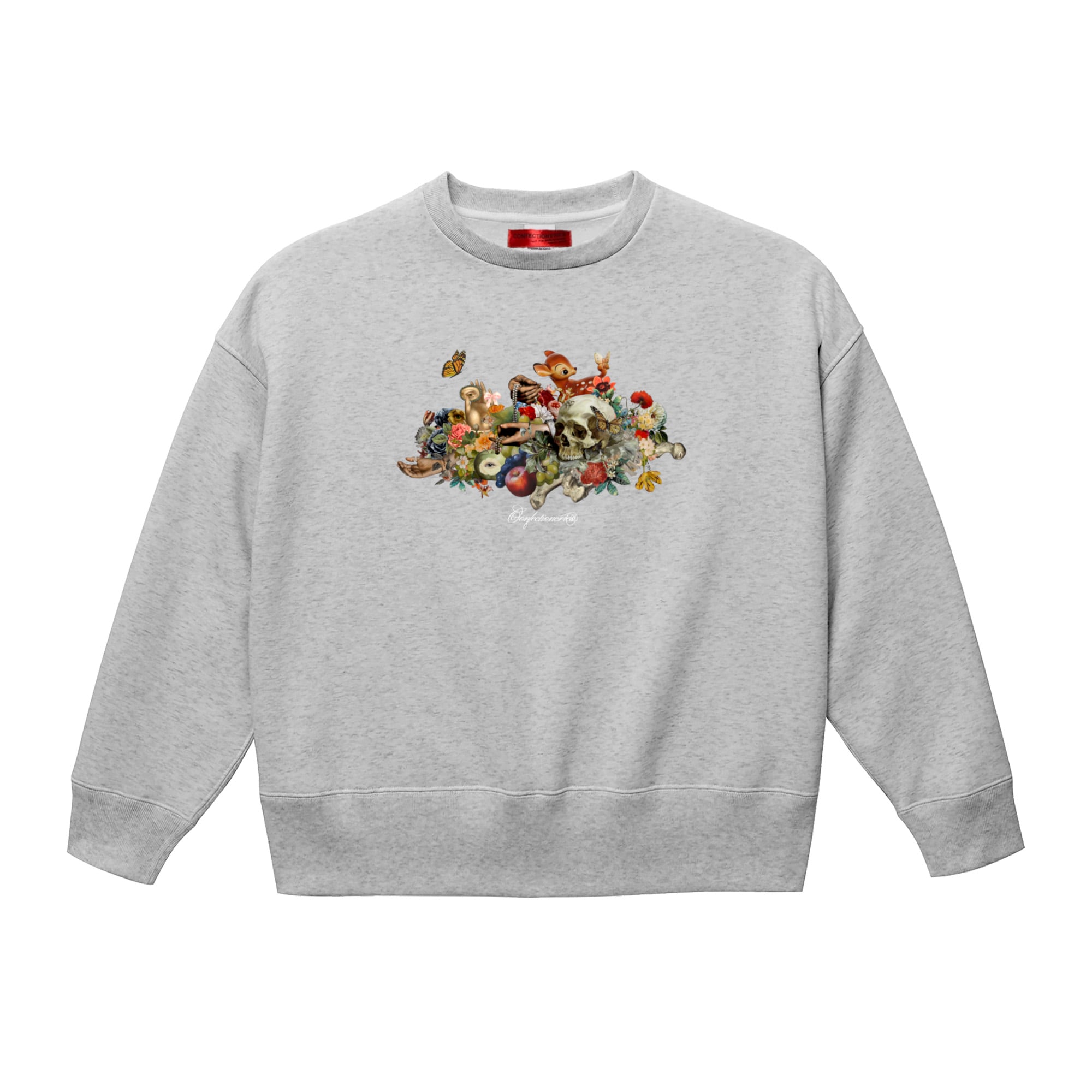 おどろおどろしくも美しく、ハズしの効いた可愛らしさと落ち着きもあり、大人でも楽しめるプリントスウェットシャツです。
