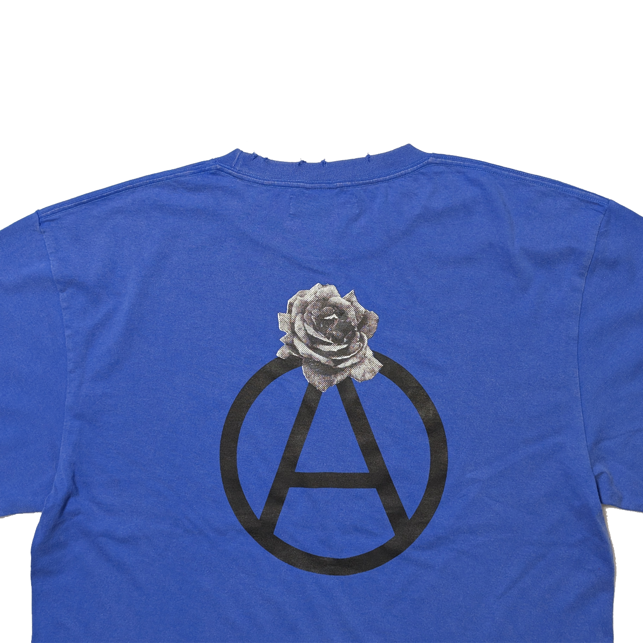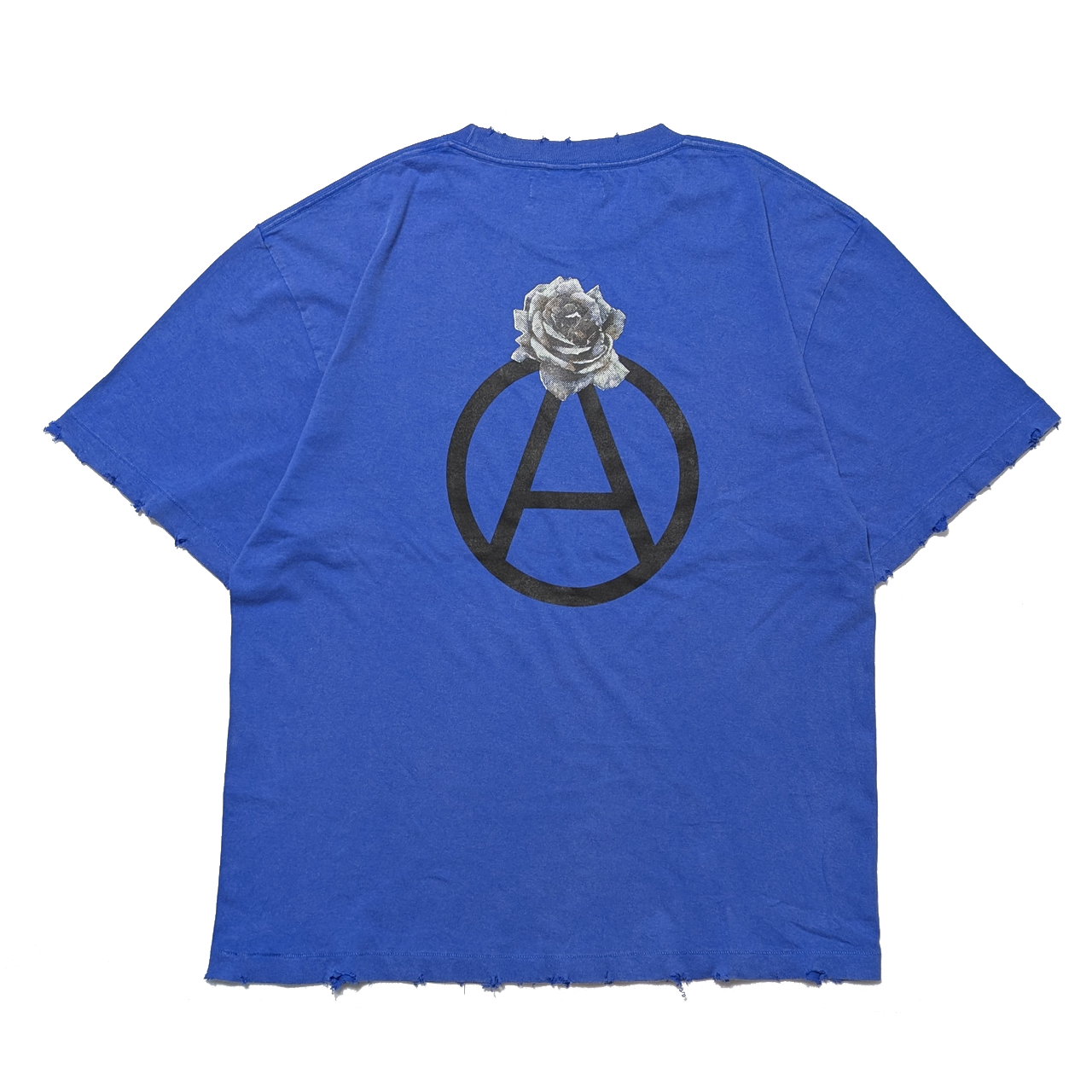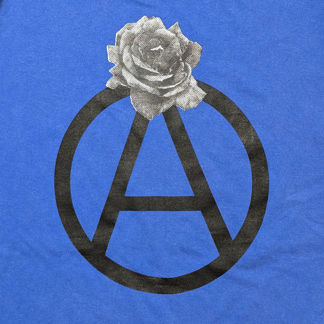 着古したような色と風合いに加工されたボディーを使い、サークルAに薔薇を添えたグラフィックをバックにプリントしました。