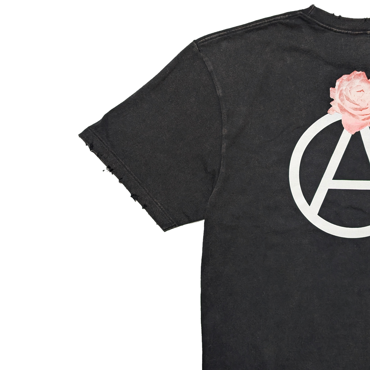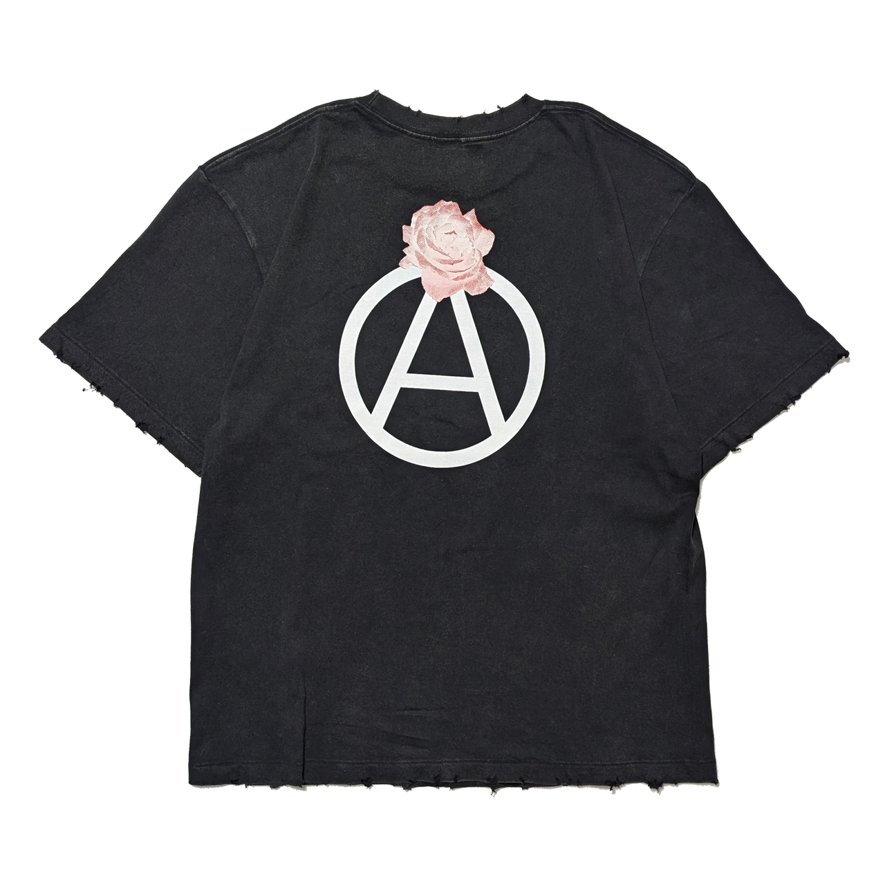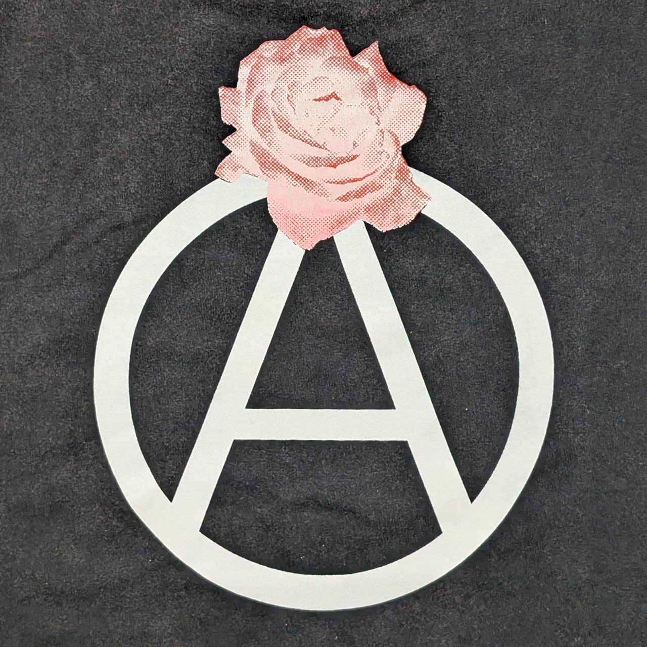 着古したような色と風合いに加工されたボディーを使い、サークルAに薔薇を添えたグラフィックをバックにプリントしました。