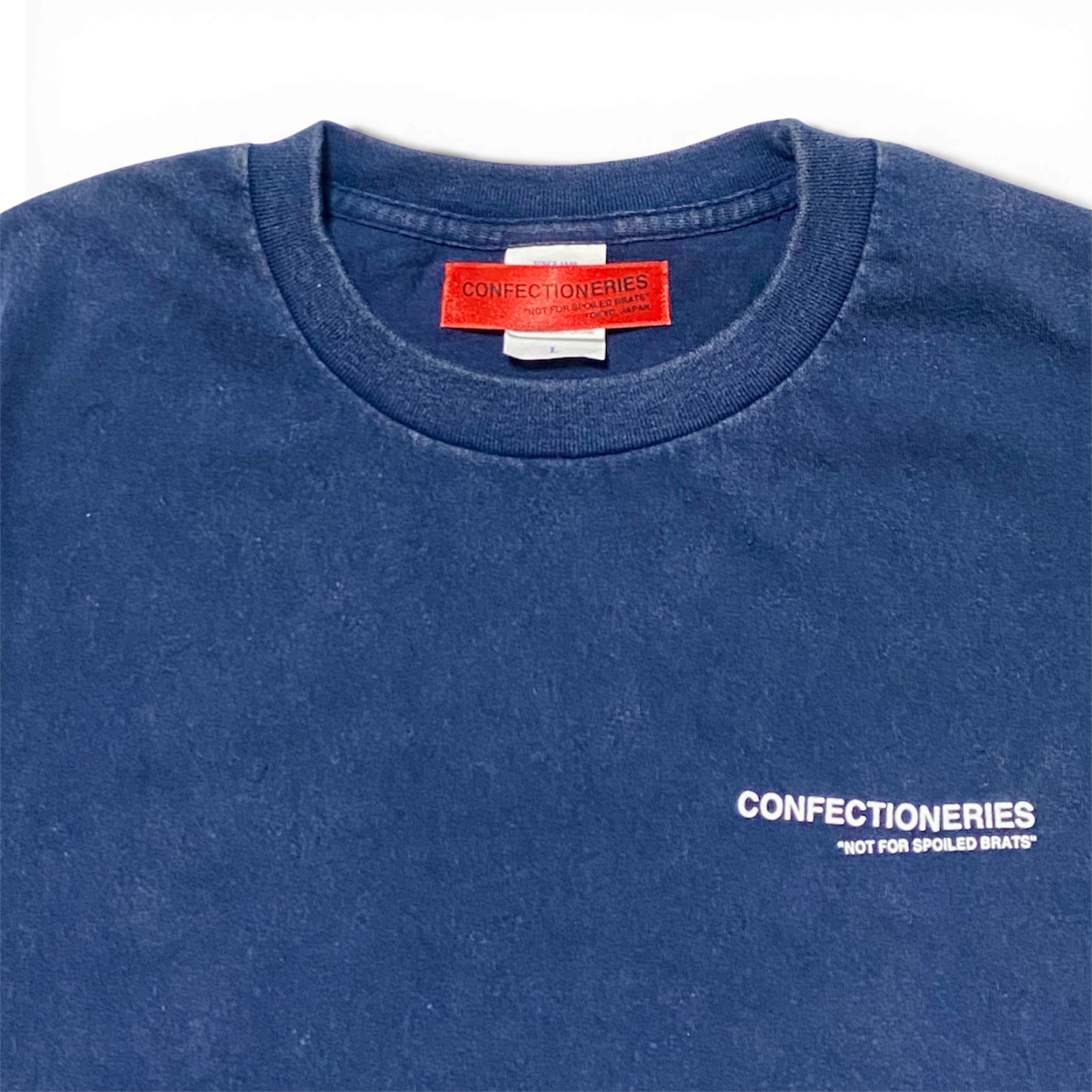 着古したような色と風合いに加工されたボディーを使い、CONFECTIONERIESオリジナルキャラクターCryeepyに昨今の情勢に対するメッセージを添えてバックにプリントしました。